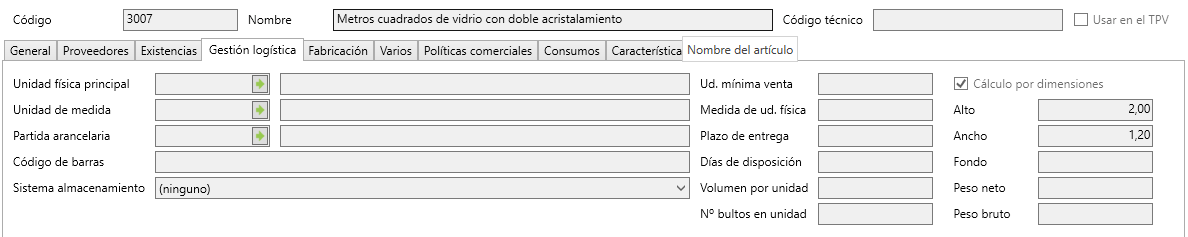 En la ficha de Artículos, en la pestaña de Gestión logística, encontramos la casilla Cálculo por dimensiones que permite activar o desactivar el cálculo automático de la cantidad de la línea en función a las dimensiones, utilizando por defecto las dimensiones establecidas en los campos Alto, Ancho y Fondo.