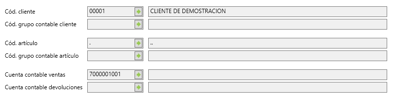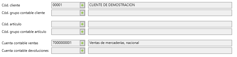 A continuación, incluyo algunos ejemplos, aunque a través de estas tablas se podrán realizar todo tipo de combinaciones posibles para definir cuentas contables por artículos, clientes o proveedores.