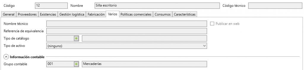 En la ficha de Artículos se puede asignar el grupo contable correspondiente al artículo, permitiendo posteriormente utilizar dichos grupos contables para definir las cuentas contables de ventas o compras.
