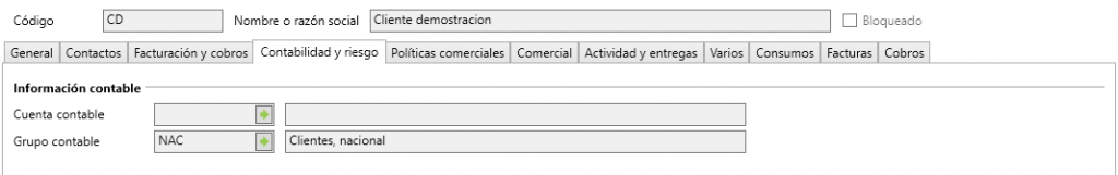 En la ficha de Clientes y Proveedores se puede asignar la cuenta contable del cliente o proveedor, aunque también se puede asignar el grupo contable correspondiente, permitiendo agrupar los clientes o proveedores que tengan la misma cuenta contable.