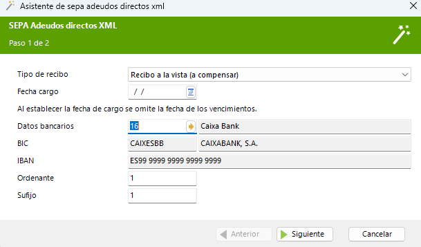 • En cuanto al Ordenante y el Sufijo, está información deberá ser proporcionada por la entidad bancaria y se puede establecer en las cuenta bancarias de la empresa, así cuando seleccionemos el banco se rellenarán automáticamente.