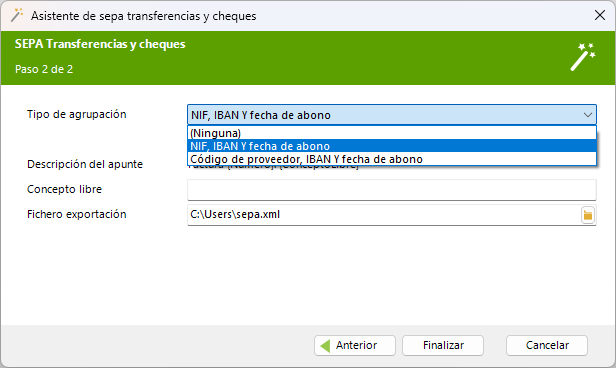 • En Fichero exportación, debemos indicar la carpeta y el nombre de archivo que se utilizará para grabar el fichero XML que posteriormente proporcionaremos al banco.