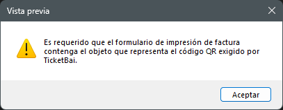 Si el tipo de SIF de la empresa es Veri*Factu o TicketBai, entonces en la impresión de facturas se comprueba que el formulario de impresión contenga el objeto que representa el código QR, en caso contrario mostrará el mensaje correspondiente y cerrará la vista previa, impidiendo la impresión.