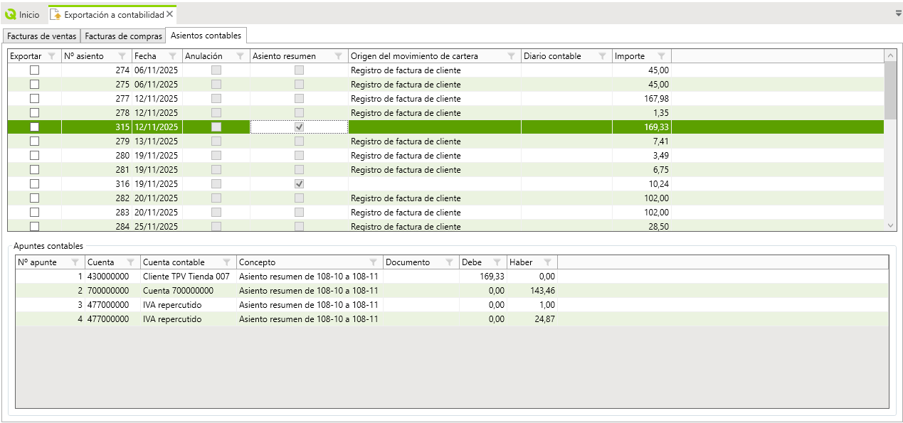 En la pantalla de Exportación a la contabilidad se incluyen en las pestañas de Asientos contables los asientos resumen, para ello se ha incluido una columna que identifica este tipo de asientos.