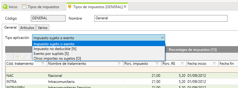 En la tabla de Tipos de impuestos se cambian los tipos de aplicación de los impuestos, quedando de la siguiente forma: