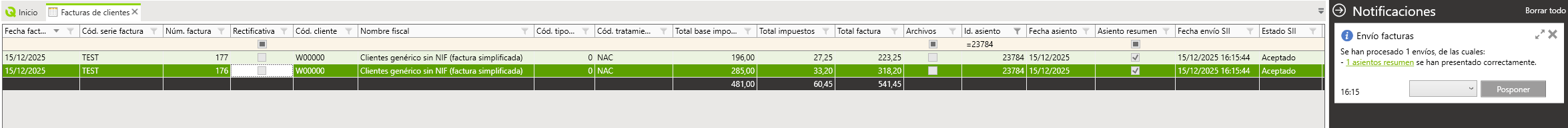 Se implementa la presentación de asientos resumen al SII, para ello solo es necesario seleccionar cualquiera de las facturas incluidas en el asiento resumen y utilizar la opción de Envío de facturas. Una vez finalizado el proceso de envío se recibirá una notificación informando del resultado del envío.