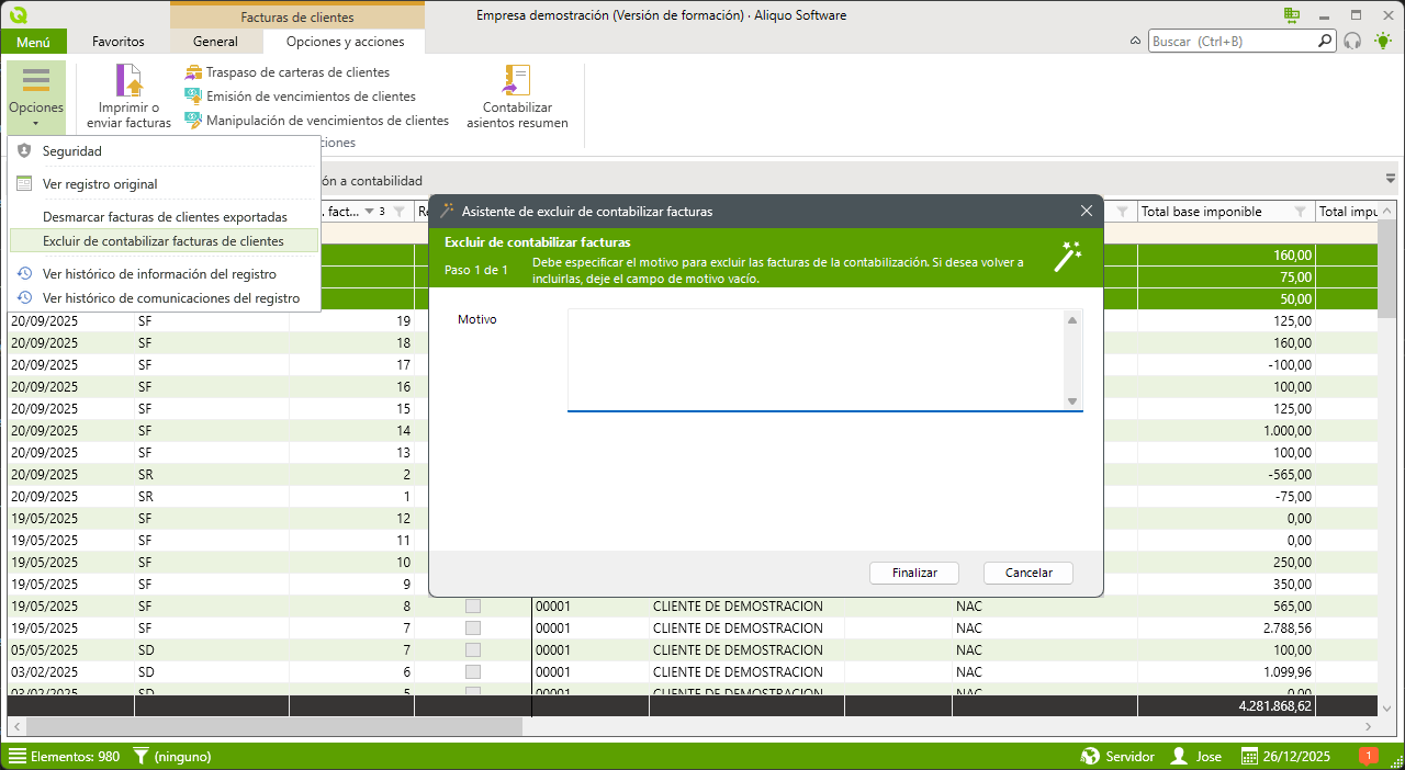 En las listas de Facturas de clientes/proveedores se incluye la opción Excluir de contabilizar facturas de clientes/proveedores en Opciones y Acciones / Opciones, para poder excluir las facturas seleccionadas de contabilizar o exportar contablemente, para ello se deberá incluir una descripción del motivo por el cual se desea excluir. También se pueden volver a incluir dejando vacío el motivo.