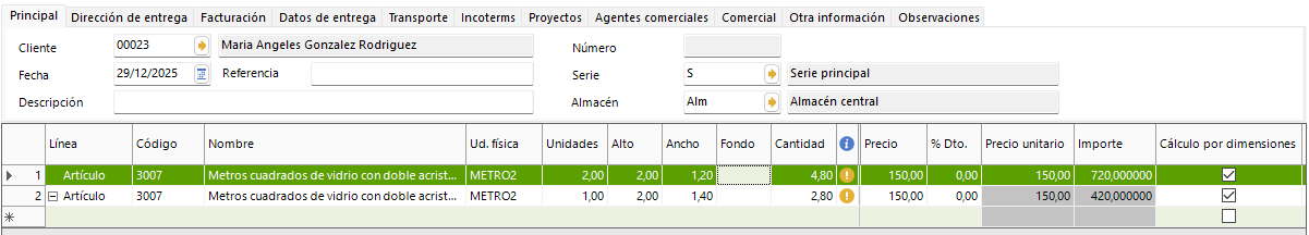 Se implementa la funcionalidad permite reflejar medidas como metros lineales, metros cuadrados o metros cúbicos, incorporando dichas dimensiones en la línea del documento correspondiente a la operación. Además, se puede definir si estas dimensiones se utilizarán para calcular automáticamente la cantidad en la operación o si simplemente se mostrarán como información adicional.
