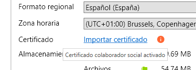 Al situar el cursor sobre el icono se mostrará la leyenda «Certificado colaborador social activado.».
