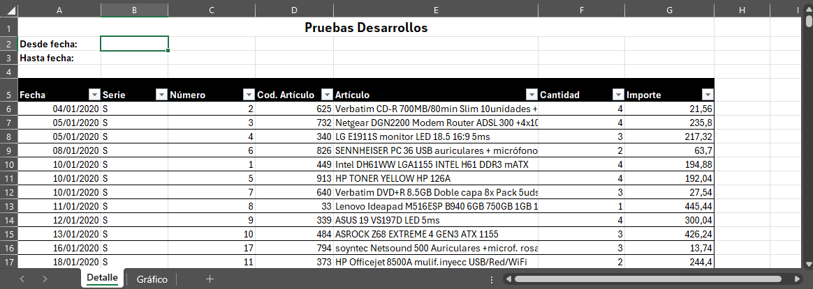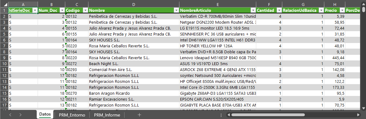 Si se desea realizar este tipo de informe, en la configuración se debe establecer en el campo Archivo la extensión de un archivo Excel (.xls; .xlsx). Además, con la opción Ver filtros se puede indicar si por defecto se desean exportar las tablas con la información de los parámetros de entorno (PRM_Entorno) y parámetros del informe (PRM_Informe), aunque también se puede activar o desactivar en el asistente del informe utilizando la opción Mostrar la configuración seleccionada en el informe.