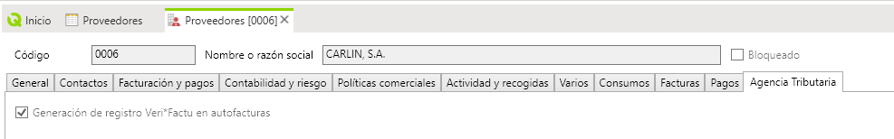 Por lo que se debe indicar si el proveedor requiere generar el registro de facturación y su correspondiente envío a la AEAT al generar la autofactura.