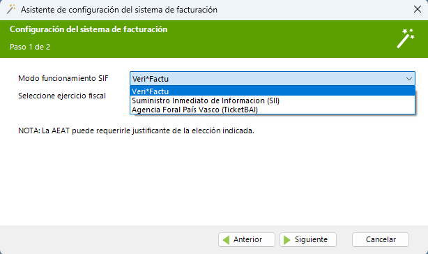 Para configurar el tipo de Sistema Informático de Facturación (SIF) es necesario realizar la configuración del mismo desde la opción Configuración del menú Ley Antifraude. Este asistente mostrará las diferentes opciones de funcionalidad, teniendo que indicar la correspondiente, según la legislación que afecte a su empresa.