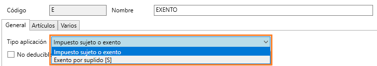 - Impuesto sujeto o exento (nulo), en este caso en la facturación se permite cualquier porcentaje. En el reglamento en el caso de exención se debe especificar en el motivo de exención.