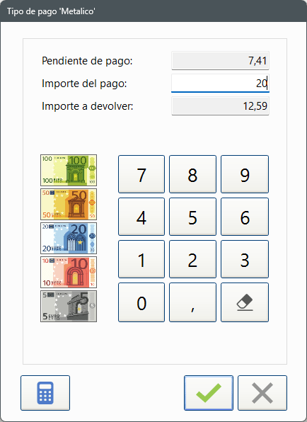 En la pantalla Tipo de pago nos aparecerá el importe pendiente de pago y deberemos introducir el importe del pago por el cliente utilizando este medio de pago. Una vez introducido el importe se calculará automáticamente el importe a devolver, y aceptando el pago nos conduciría de nuevo a la pantalla de Finalizar la venta.
