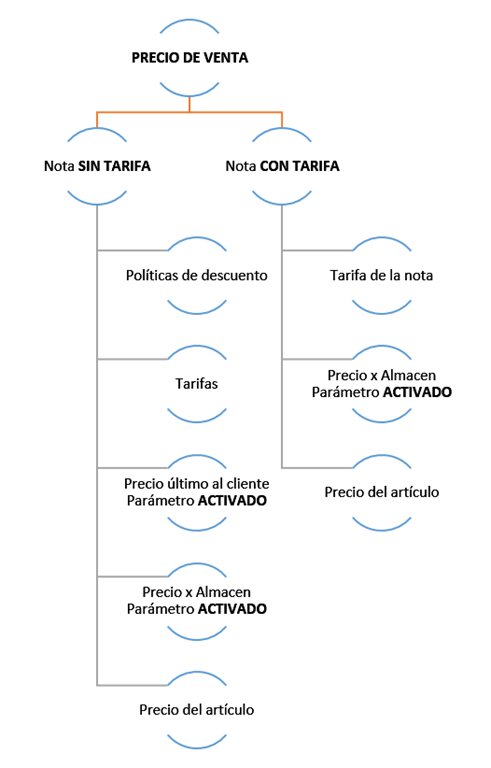 En Aliquo la operativa de obtención de los precios de venta en los documentos, viene determinada por un sistema de prioridades que se debe tener muy en cuenta a la hora de definir las políticas de descuento, tarifas, precios o parametrización de precios. Para entender como funciona este sistema, a continuación se presenta un esquema de como se obtendría el precio de venta según sea el caso.
