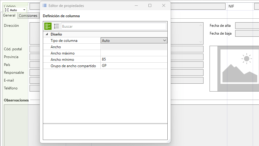 También se han establecido en algunas de las definiciones de columnas de tipo Auto la propiedad de Grupo de ancho compartido, con el fin de permitir que columnas de diferentes secciones tengan el mismo ancho a pesar de ser de tipo Auto.