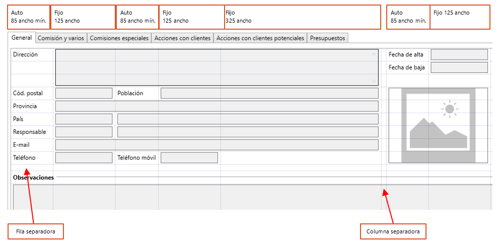 En las tablas que se encuentran direcciones, el diseño puede ser algo más complejo, aunque se sigue el mismo criterio, definiendo las columnas que contienen controles de etiqueta como tipo Auto con anchos mínimos y si es un campo con controles de edición de datos como tipo Fijo.