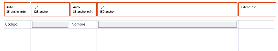 Como norma general se utilizan columnas Auto para las etiquetas con un ancho mínimo de 85 si los texto son pequeños, columnas fijas de 125 para los códigos y columnas fijas de 450 para los nombres.