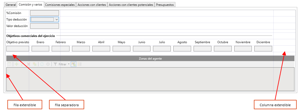 Hay un tipo de fila y de columna que se llama Extendible, se suele poner al final de la tabla para que ocupe todo el espacio que queda libre de pantalla, tanto en columna como en fila. Igualmente se puede utilizar una fila de tipo Separador para dejar un pequeño espacio por encima de los grupos de controles y tablas de datos, para así evitar que la información quede muy junta visualmente.